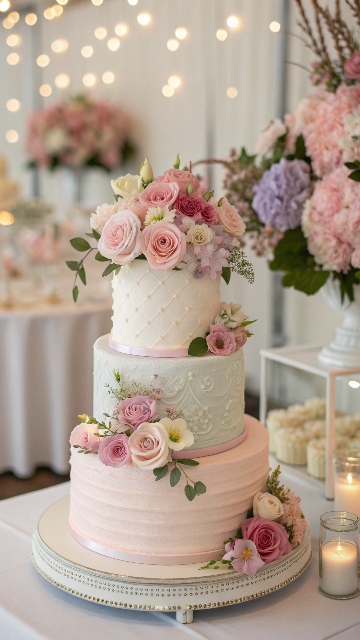 This cake often features pearl accents or edible gold leaf for a luxurious feel. The soft, muted colors make it a versatile choice for various wedding themes. It’s a perfect match for couples who appreciate classic elegance.