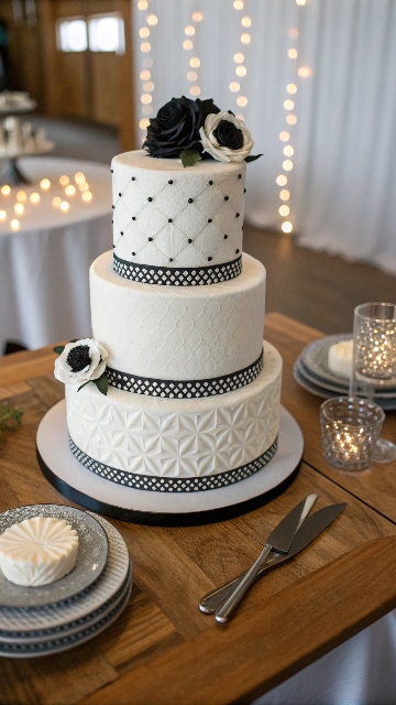 Pair this cake with matching table settings or decor for a cohesive look. The monochrome design is both modern and timeless. It’s a great way to create a polished and sophisticated vibe on your special day.