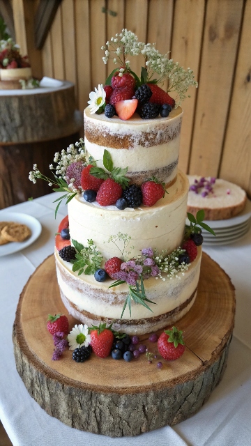 Pair this cake with wooden cake stands or vintage tableware for a cohesive look. It’s a perfect match for couples who want a relaxed and intimate vibe. The naked cake trend continues to be a popular choice for modern weddings.