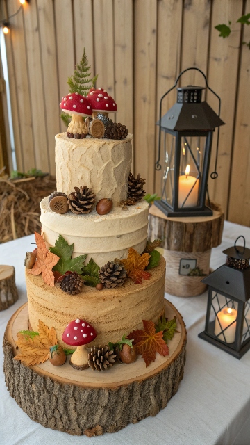 Pair this cake with wooden decor or lanterns for a cohesive look. The rustic woodland design is both warm and inviting. It’s a great way to create a cozy and magical atmosphere on your special day.