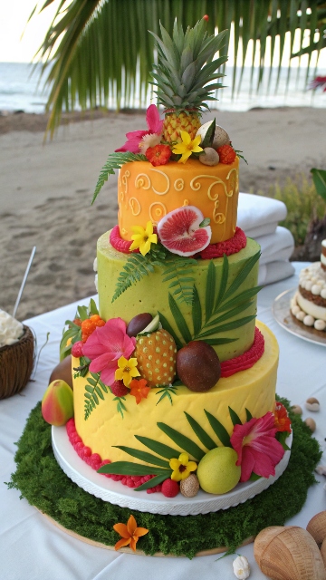 This cake often features fresh fruits like pineapples, mangoes, or coconuts for a fun touch. The bold and colorful look makes it a favorite for couples who want a cake that’s both delicious and eye-catching. It’s a perfect match for those who love a tropical vibe.
