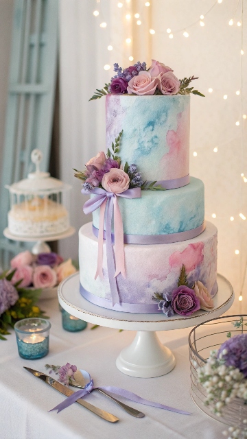 Pair this cake with artistic decor or soft lighting for a cohesive look. The watercolor design is both whimsical and elegant. It’s a great way to express your personality on your special day.