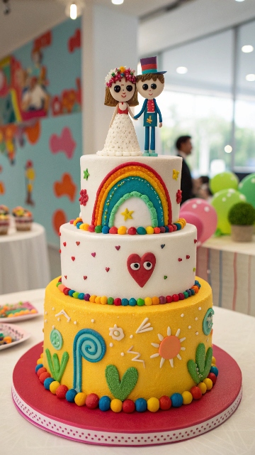 A whimsical two tier wedding cake is perfect for couples who want a playful and fun design. Bright colors, quirky decorations, and unique shapes make this cake a standout piece. It’s a great choice for unconventional or themed weddings.