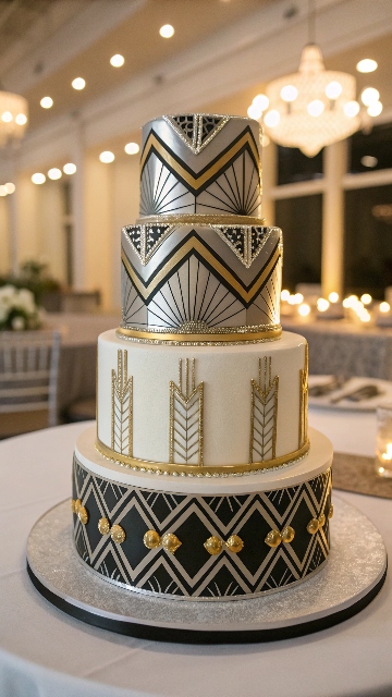 Pair this cake with crystal decor or vintage tableware for a cohesive look. The Art Deco design is both glamorous and sophisticated. It’s a great way to add a touch of old-world luxury to your celebration.