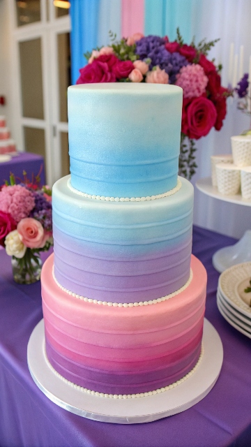 This cake often features shades of blue, pink, or purple for a dreamy effect. The smooth fondant finish and seamless color transition make it a favorite for contemporary weddings. It’s a perfect match for couples who want a bold and unique cake.