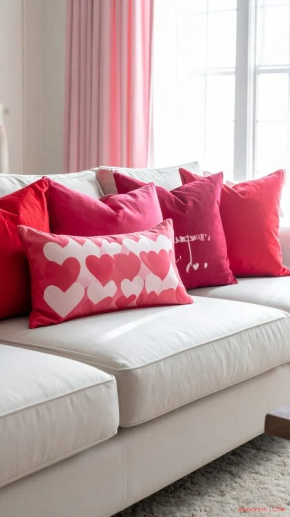 Swap out your regular throw pillows for Valentine’s Day themed ones. Choose pillows with heart patterns, romantic quotes, or festive colors like red and pink.