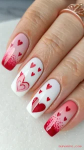 You can add a touch of glitter to the ombre effect for extra glamour. This design works well with any nail length and shape. It’s a great way to incorporate the colors of love into your manicure.