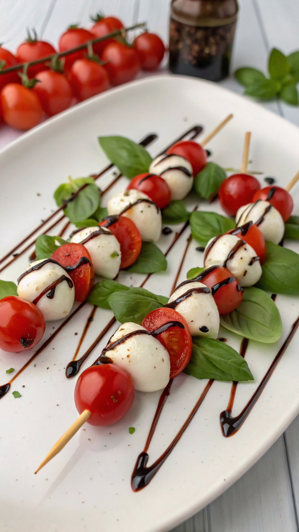 To make these skewers, you will need fresh mozzarella balls, cherry tomatoes, fresh basil leaves, balsamic glaze, and skewers. The preparation is simple and quick, allowing you to focus on enjoying the evening with your loved one.