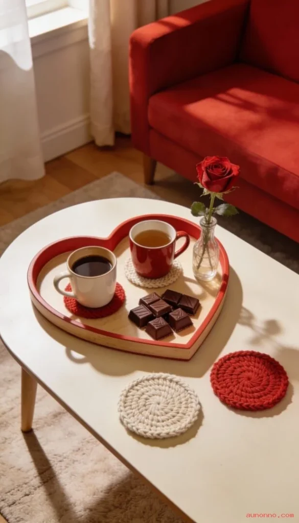 A tray makes a small moment feel special. Use a heart-shaped tray or a normal tray with heart accents. Add mugs, chocolates, and a small flower bud vase.