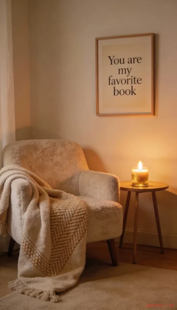 Add a simple framed print with a love quote or abstract heart. Keep the frame neutral so it fits the room. Place a small vase with flowers on one side for balance.