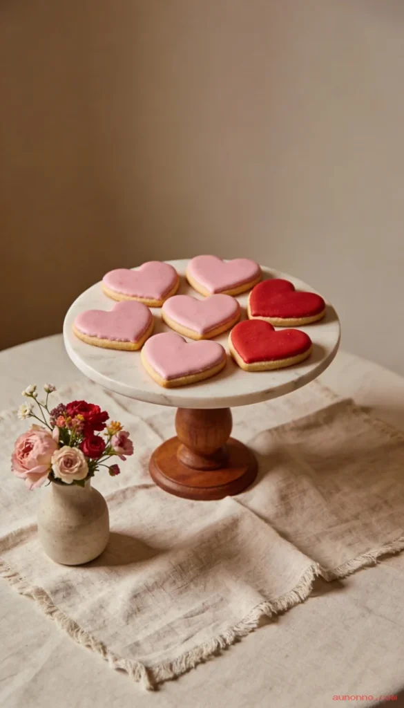 Edible decor feels fun and welcoming. Bake or buy heart-shaped cookies and place them on a cake stand. Use icing in soft colors for a clean look.