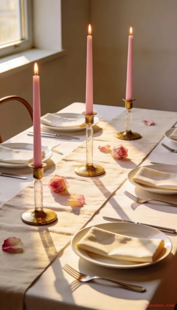 Taper candles feel elegant and easy. Choose pink tapers for a Valentines Day mood. Use simple holders in glass, ceramic, or brass.