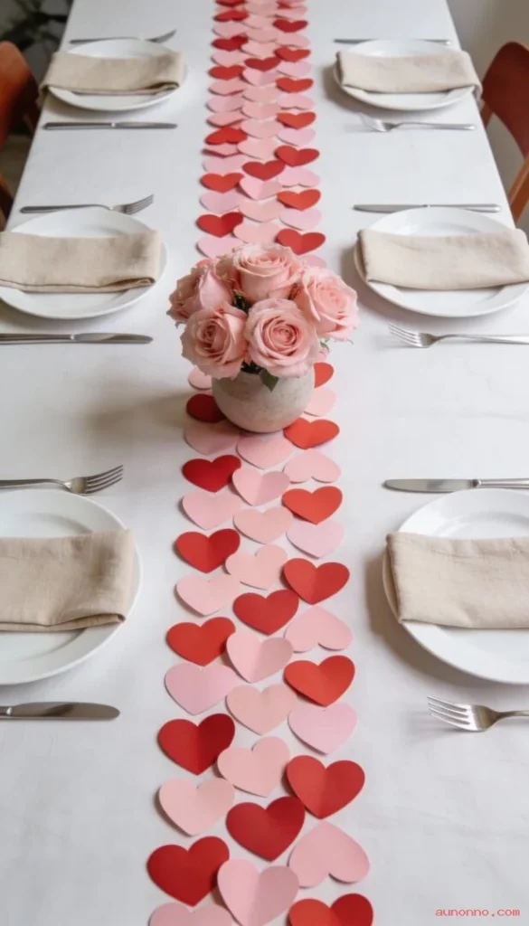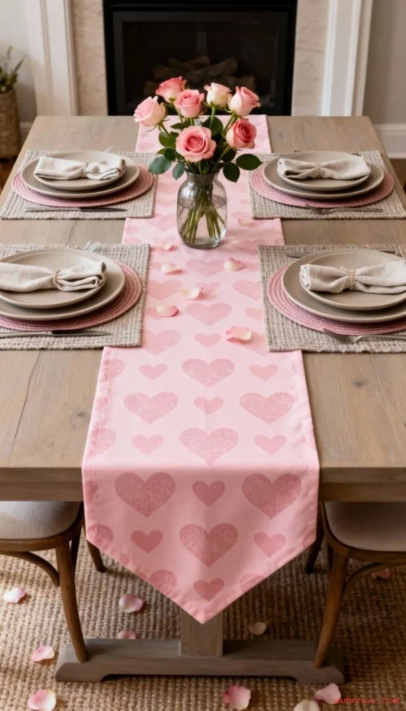 A table runner helps you style a dining table fast. Choose a runner in red, pink, or a soft neutral with tiny hearts. This creates a base that makes everything look coordinated.
