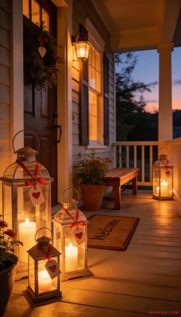 Outdoor decor can feel romantic too. Place lanterns on the porch with battery candles inside. Add small heart tags tied with ribbon to each lantern.