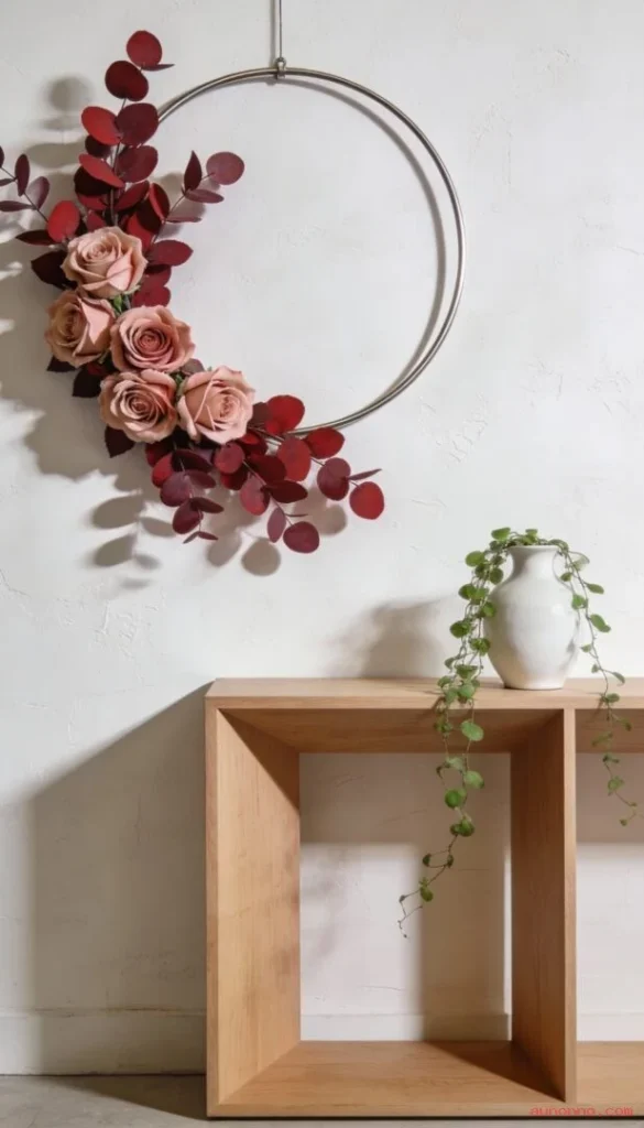 A floral hoop wreath looks modern and light. Use a metal hoop and attach faux flowers on one side. This creates a clean design with negative space.