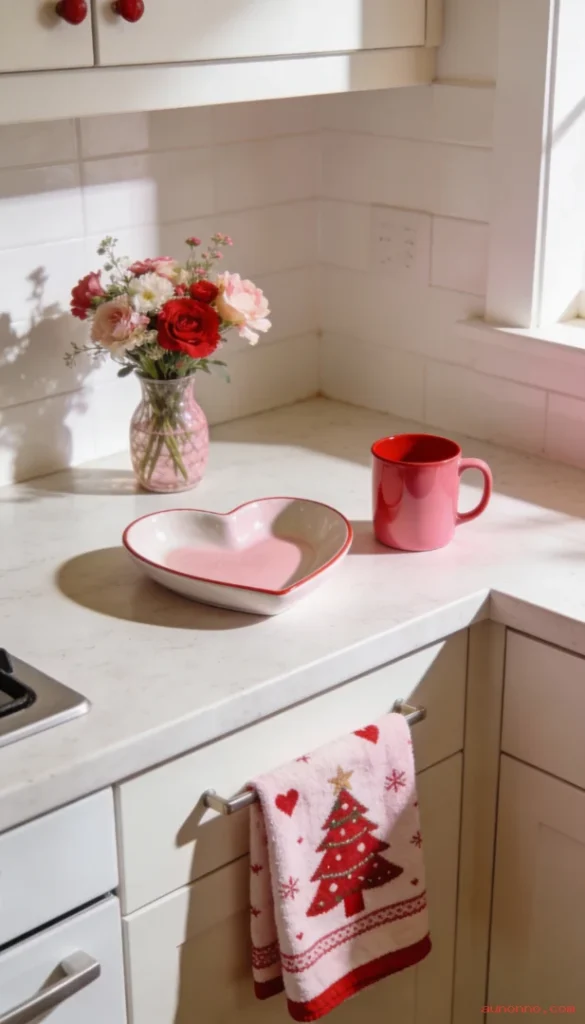 Kitchen decor can feel fun and simple. Place a small vase of flowers, a heart-shaped dish, and a cute towel. Keep it near the sink or coffee maker.