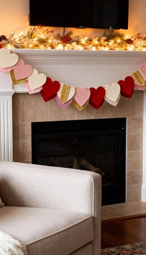 A heart garland adds instant Valentines Day charm across a mantel, window, or headboard. You can mix felt, cardstock, and fabric hearts to create depth and a handmade feel. This also looks great in photos because the layers catch light differently.