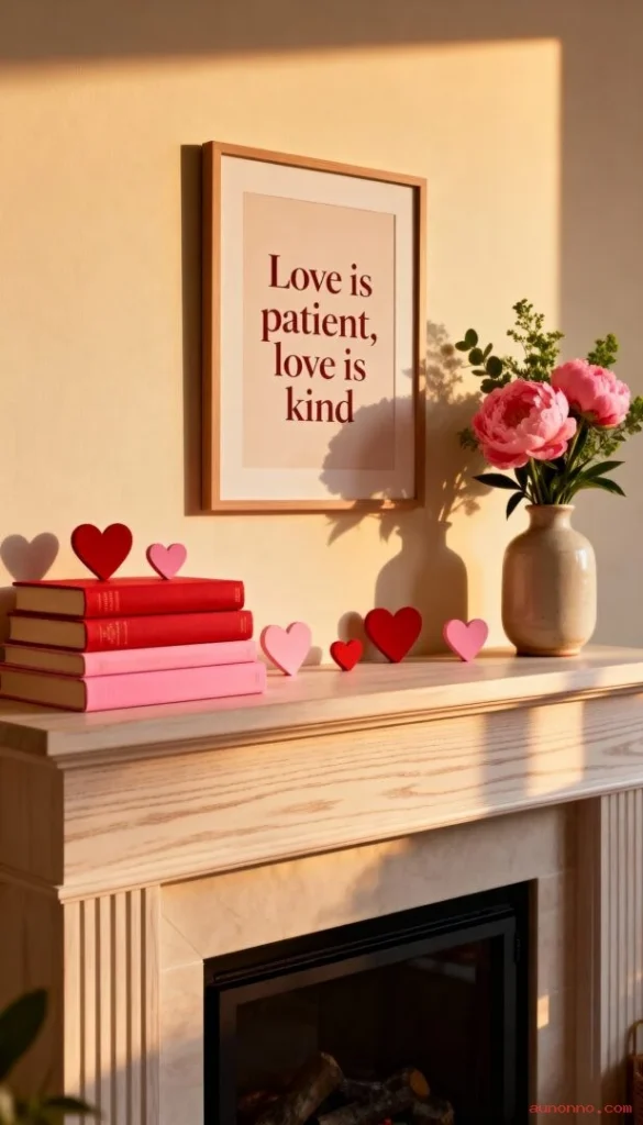A mantel is perfect for seasonal decorating. Stack a few books with red or pink covers and add small heart accents. This creates height and structure without needing many items.