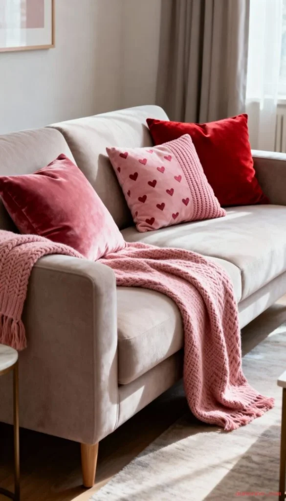 Throw pillows are a fast way to bring Valentines Day decor ideas into a living room. You can swap covers instead of buying new inserts. This keeps the update affordable and easy to store later.