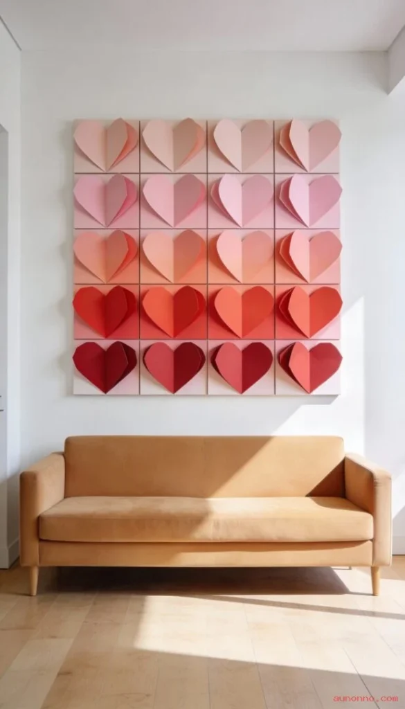 Paper heart wall art costs very little and looks cheerful. You can fold or cut hearts in matching sizes. Arrange them in a pattern like a heart outline or ombré grid.
