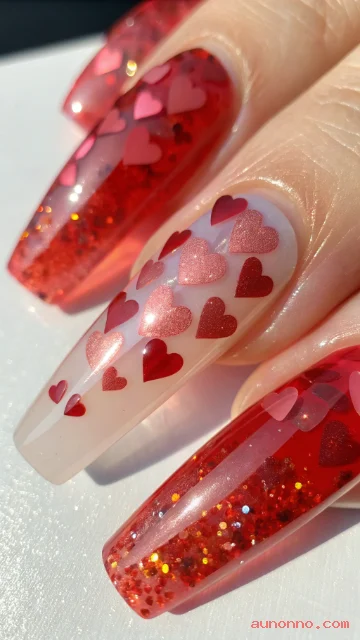Red or pink chunky glitter works best for the Valentine’s theme. The gradient effect softens the look and makes it more wearable than a solid glitter coat. It reflects light beautifully and looks amazing in candlelit settings.