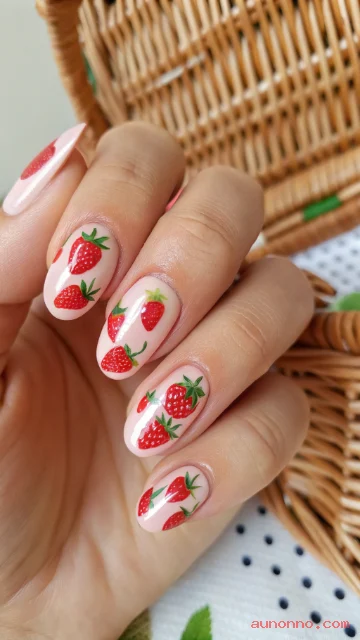 Strawberries are cute, red, and heart-shaped, making them perfect for this holiday. Paint tiny strawberries on a pink or white checkered background for a “picnic” vibe. Or, simply paint red strawberries on a nude base.