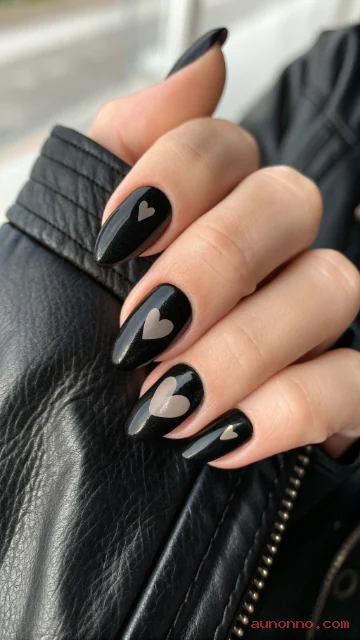 Valentine’s Day doesn’t have to be all bright and cheery colors. A black manicure with heart details is perfect for the anti-Valentine or edgy aesthetic. Use a glossy black base and add matte black hearts for a subtle texture contrast.