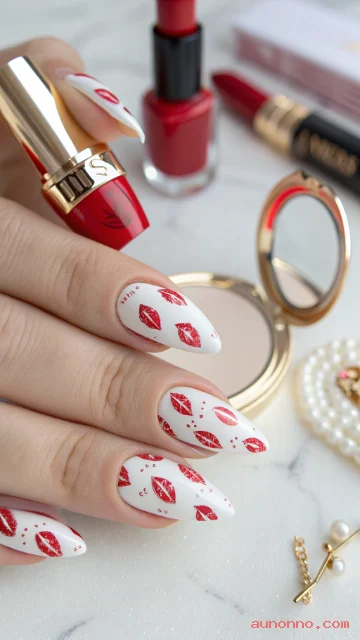Red and hot pink are the obvious color choices for the kisses. Make them look glossy by adding a top coat, or matte for a stamped look. Scattered kisses look flirty and playful.