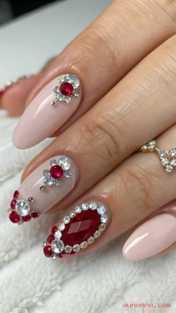 Use different sizes of rhinestones for a tapered effect. Clear crystals are classic, but red or pink gems fit the theme well. Ensure you use a strong gem gel to keep them secure.