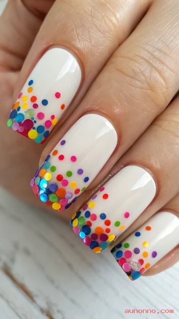 You can concentrate the confetti at the tips or the base. It is impossible to mess up because random placement looks best. It is the ultimate easy, low-stress nail art.
