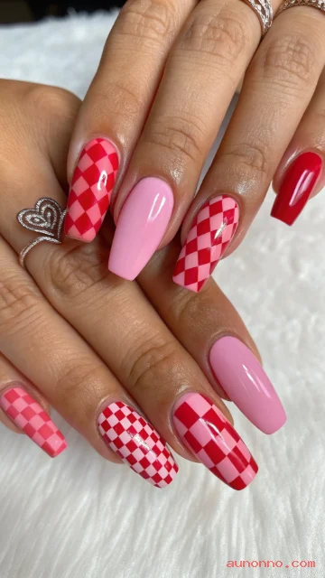 Checkerboard prints are funky, skater-inspired, and can be made romantic with color. Swap the traditional black and white for pink and red squares. You can do a full nail of checks or just a funky French tip.