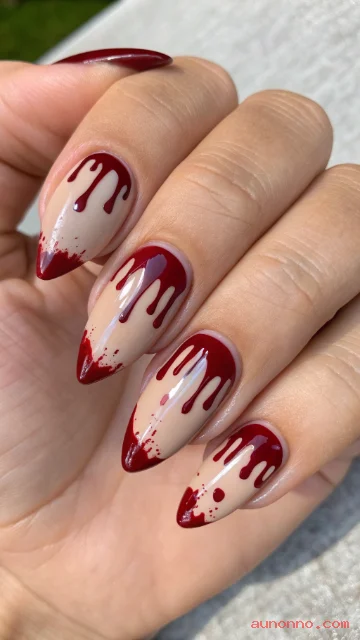 Make the drips look 3D by adding a highlight of white or a shadow. A glossy top coat makes the “blood” look wet and fresh. It is a bold choice for the adventurous nail art lover.
