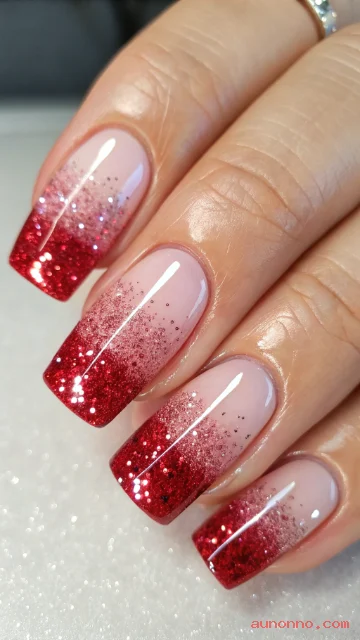 Glitter ombré is a festive way to add sparkle without committing to a full glitter nail. Start with a clear or nude base and sponge glitter onto the tips. Fade the glitter down toward the middle of the nail for a cascading effect.