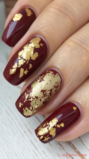 Gold foil adds a luxurious, scattered metallic texture to any manicure. Apply bits of gold leaf over a deep wine red or burgundy polish. The contrast between the dark red and the bright gold is rich and regal.