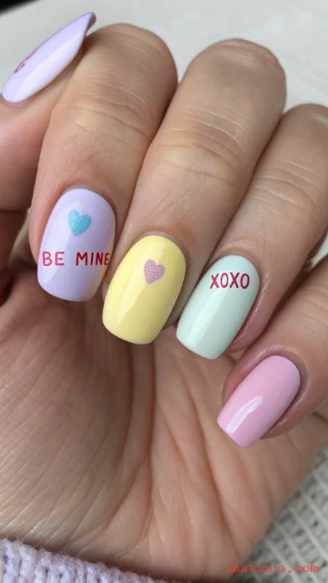 Recall the nostalgia of conversation hearts with a pastel color palette. Paint each nail a different soft shade like lavender, mint, yellow, and baby pink. This multicolor look is fun, youthful, and breaks away from the strict red-and-pink rule.