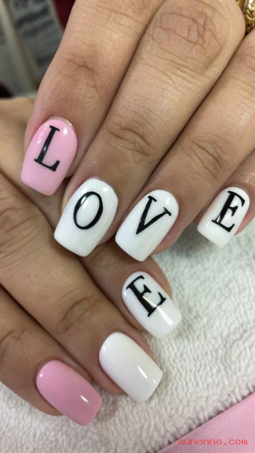 Spell out your feelings directly on your nails with cute lettering. Paint each nail a solid color like white or soft pink to serve as a canvas. Use a thin brush or decals to write “L-O-V-E” across your fingers.