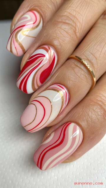 Swirls and waves are a versatile design that can be adapted for any holiday. Use shades of pink, red, and white to create flowing lines across a nude base. The organic shapes are forgiving to paint and don’t need to be symmetrical.