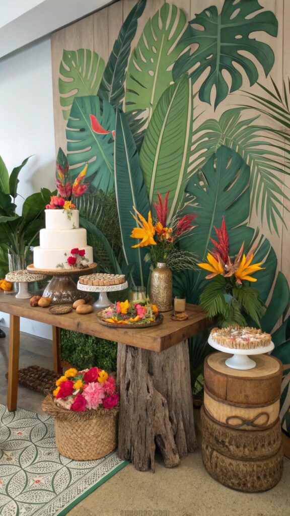 Use large tropical leaves as backdrop or table decor, incorporate bright flowers like birds of paradise or hibiscus, and add decorative elements that suggest exotic locations. Consider using wooden elements and natural textures to ground the design.