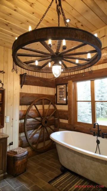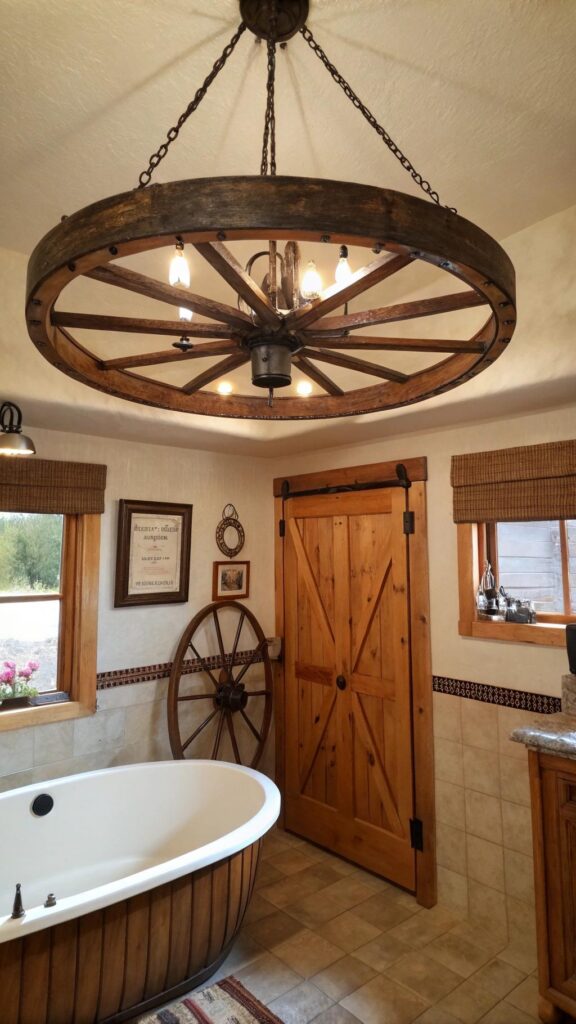 A vintage wagon wheel light fixture can serve as a bold statement piece in any western-themed bathroom. These large, circular fixtures made from wood or wrought iron evoke the old frontier days and bring a charming, rugged atmosphere to your space. Wagon wheels make excellent chandelier alternatives, providing ample light while enhancing the rustic style.