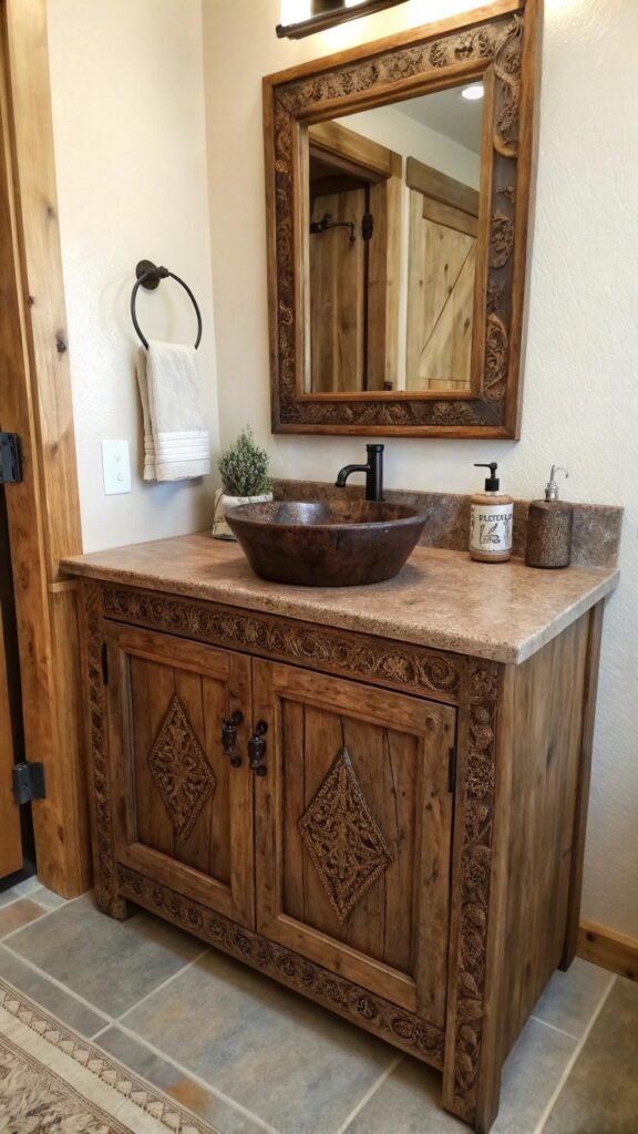 A western bathroom isn’t complete without a rustic vanity that adds both functionality and charm. Wooden vanities, particularly those made from reclaimed wood, bring a natural, earthy feel to your space.