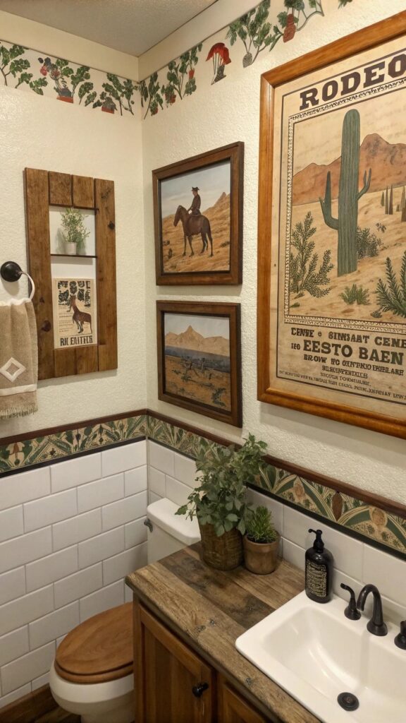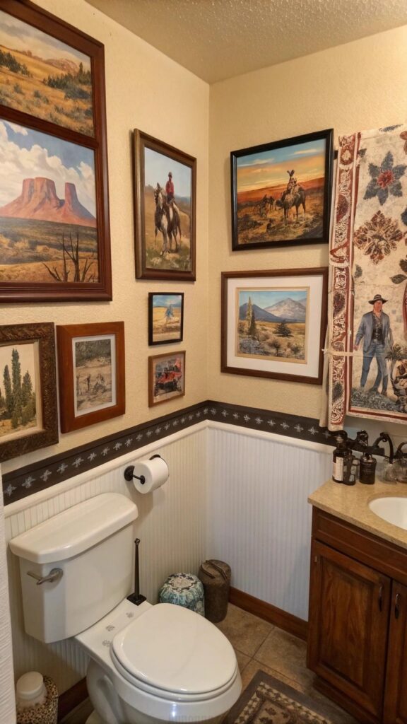 You can also mix and match different art pieces to create a gallery wall that gives the bathroom a more lived-in, eclectic feel. Whether you prefer vintage-style prints or more modern interpretations of western art, wall decor can tie the room together.