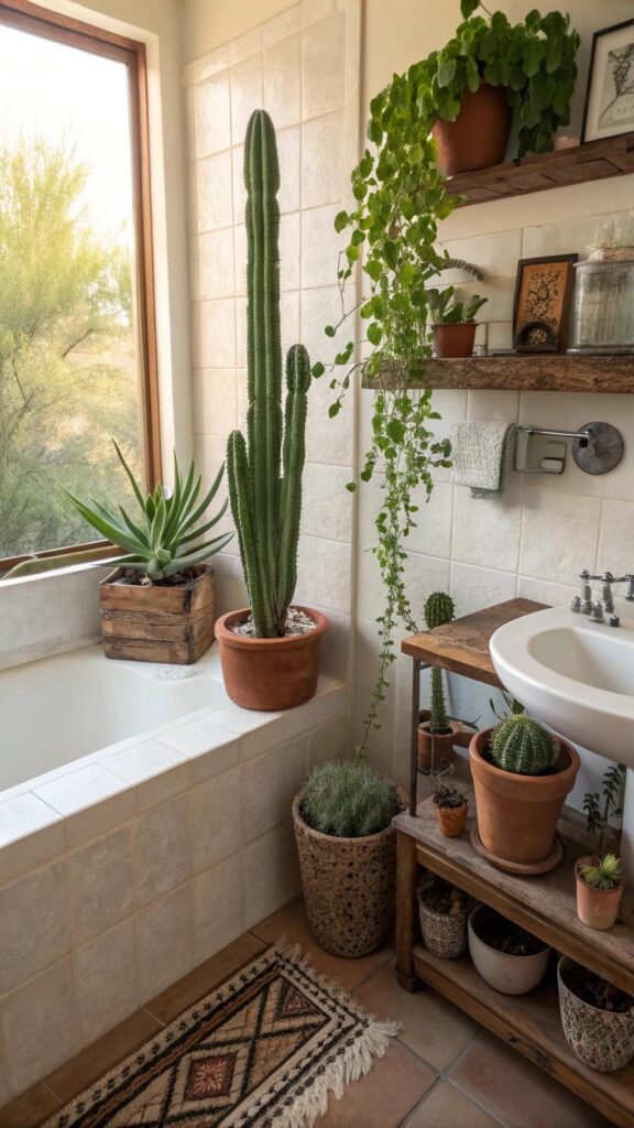 These low-maintenance plants thrive in dry conditions, making them ideal for a bathroom. Use terracotta or rustic metal planters to maintain the rustic theme and place them where they’ll get plenty of natural light.