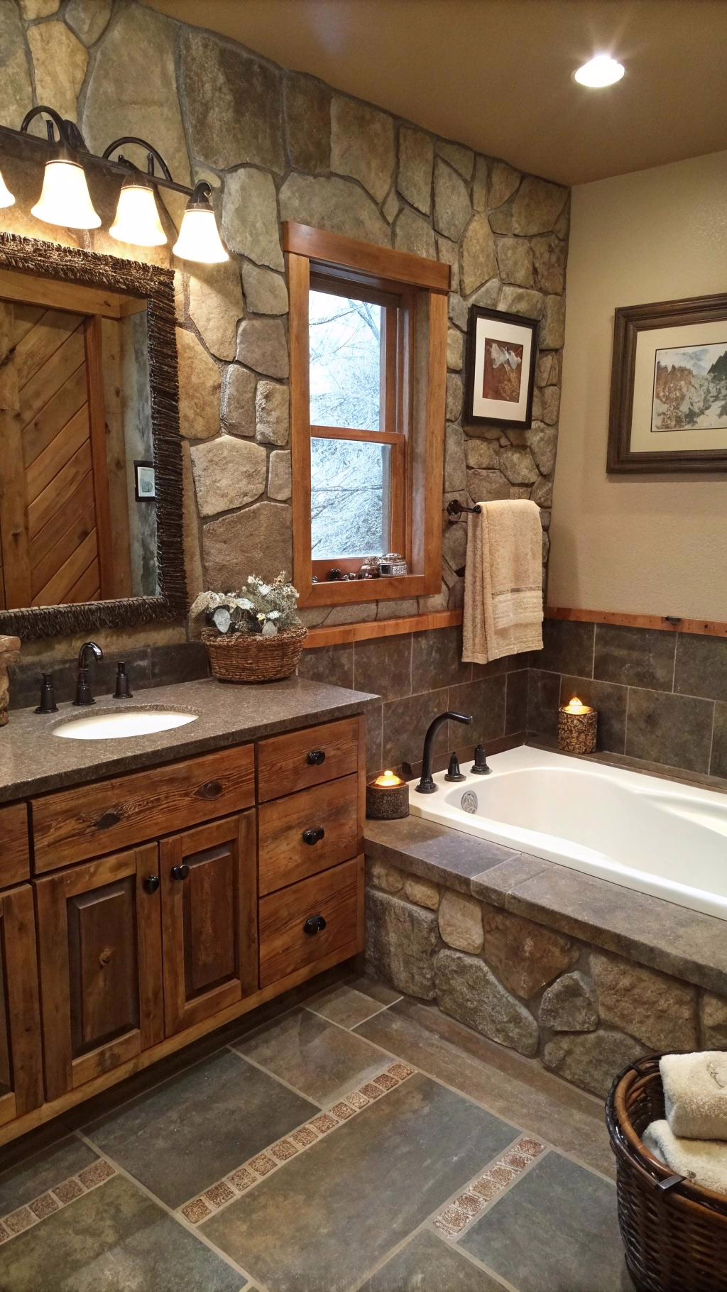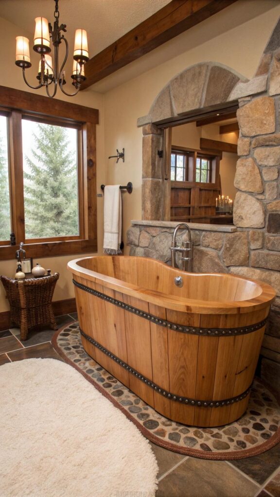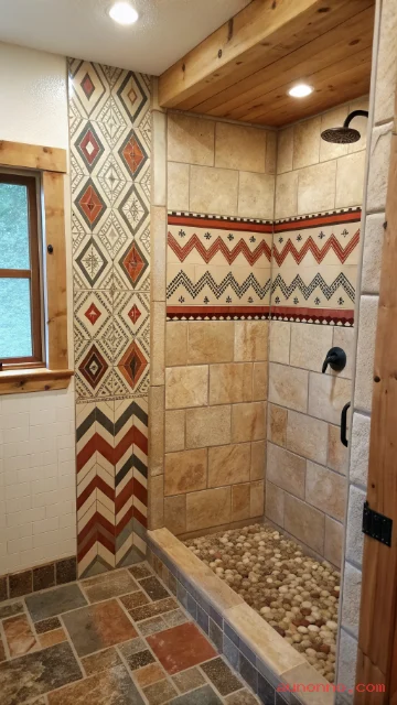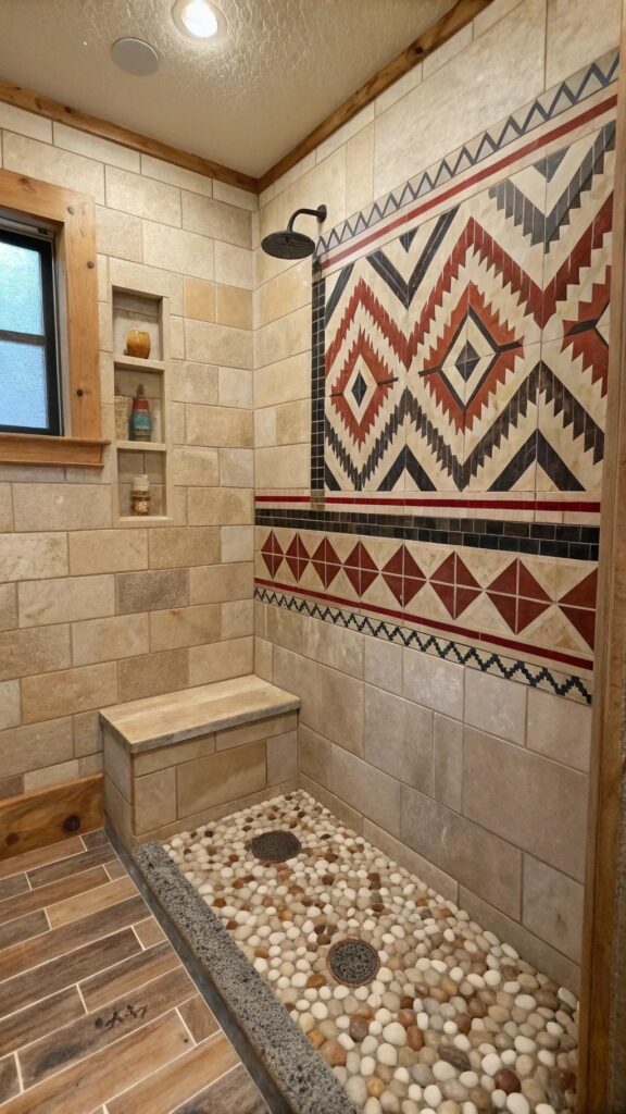 For added flair, use stone or pebble tiles on the shower floor for a natural, earthy feel. Mixing materials like wood and stone in the shower can give your bathroom a spa-like experience with a touch of the Wild West.