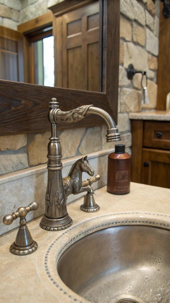 For an added touch, choose faucets with horse or cactus designs or ones with rustic handles, like those made from leather or wrought iron. These details create a cohesive look and provide a charming focal point in your bathroom.