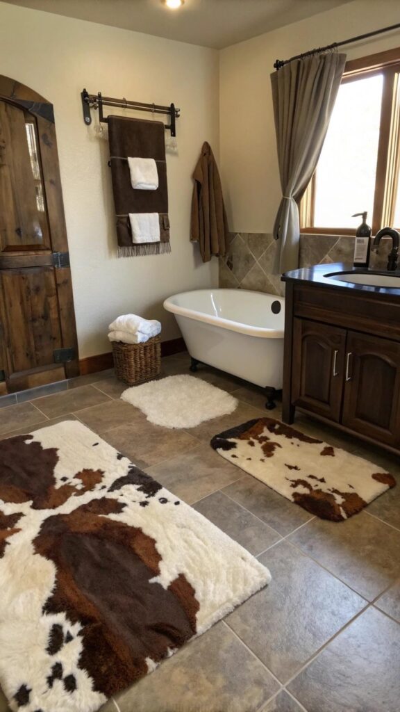 For a more cohesive look, pair cowhide rugs with leather furniture or fixtures. Leather chairs or a leather cabinet can really tie the western theme together. Additionally, cowhide can be a bold statement piece, so balance it out with neutral or earthy tones in the rest of your bathroom design.