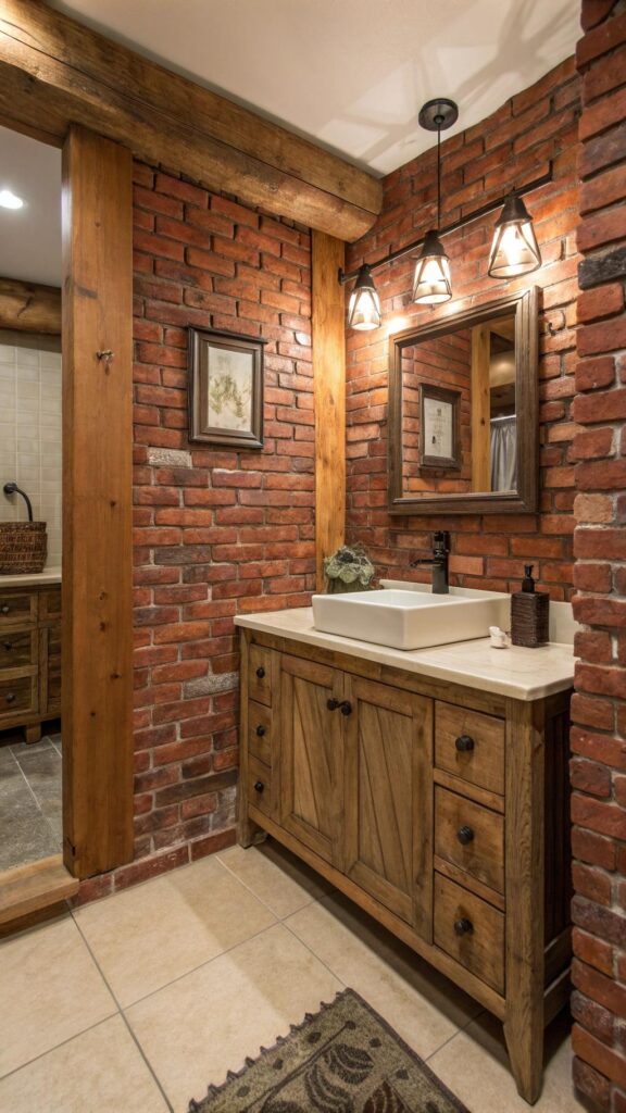 If you’re looking for a more dramatic and bold western bathroom idea, consider installing exposed brick walls. This adds a rugged and industrial touch that pairs beautifully with rustic decor. The red tones of brick complement wooden fixtures and can help bring a cozy yet raw feel to the room.