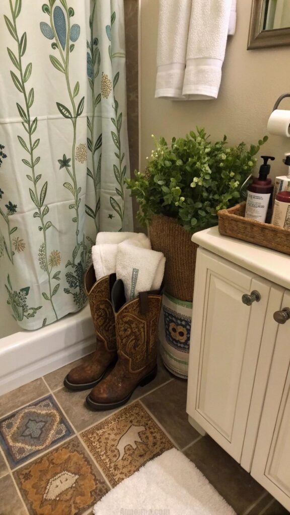 Incorporating cowboy boots into your bathroom design can be both functional and stylish. Use them as quirky storage solutions for towels, toiletries, or even as a stand for plants. Cowboy boots, whether vintage or new, add an authentic touch to the western theme. A set of boots can be placed near the door as a decorative piece or filled with greenery for a unique touch.