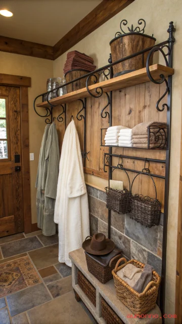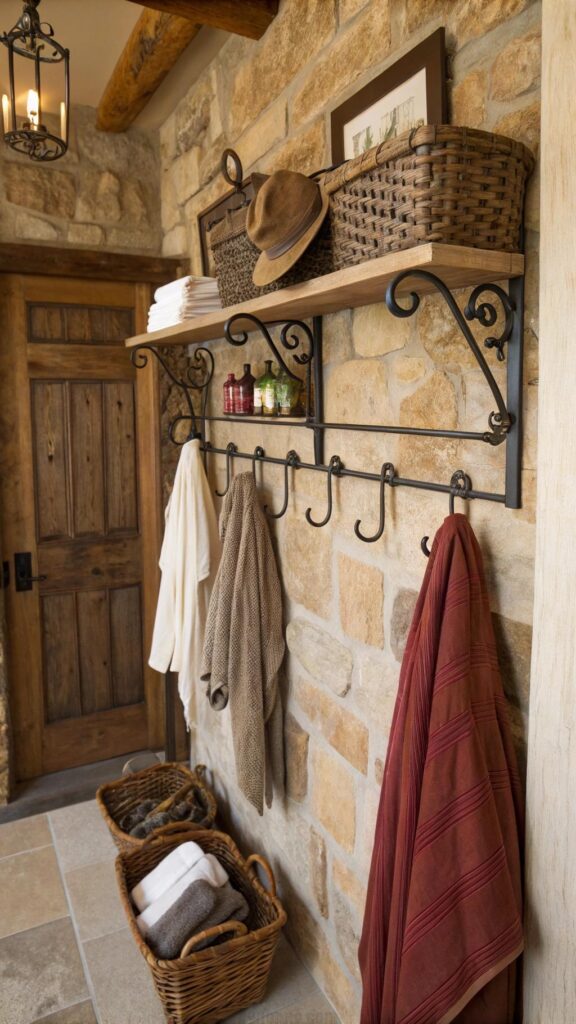 You can also use iron racks to hold baskets or toiletries. The dark metal contrasts beautifully with wood and stone, enhancing the rustic atmosphere.