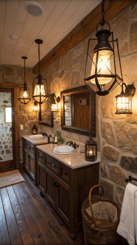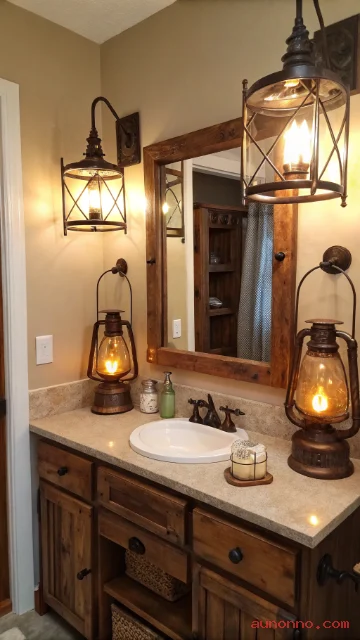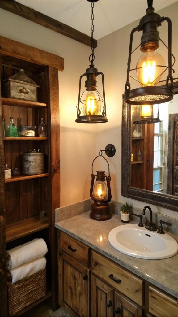 To add some warm and soft lighting to your bathroom, consider incorporating vintage western lanterns. These lanterns, often made of metal with glass, give off a warm glow that enhances the rustic charm. You can use them as wall sconces on either side of your mirror or as pendant lights above your sink area.