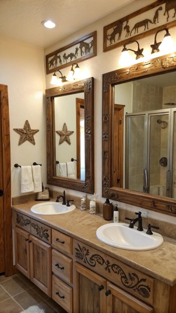 For a true western aesthetic, look for mirrors with carved designs featuring horseshoes, cacti, or even stars. Adding a large mirror can also make your bathroom feel more spacious while contributing to the theme.
